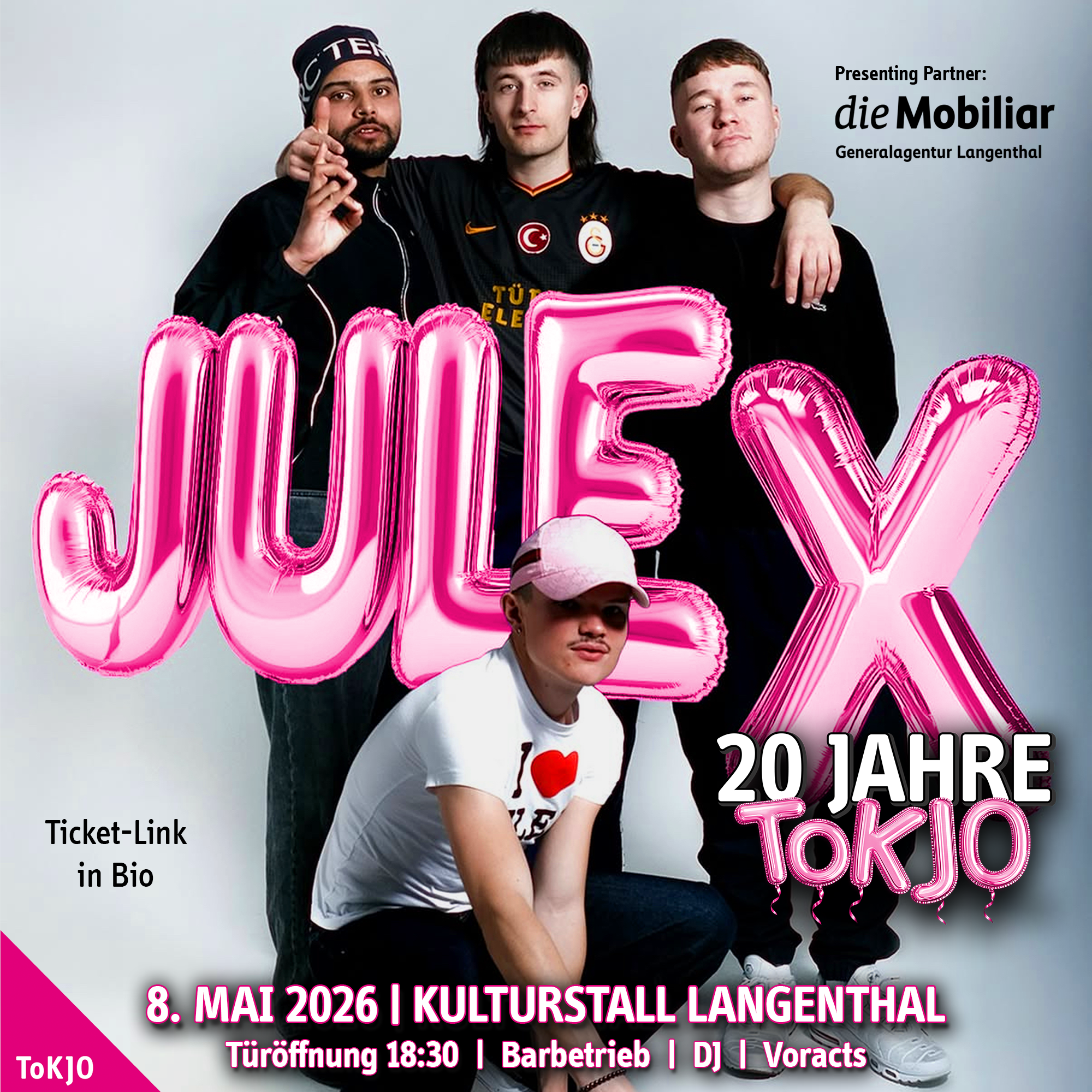 Zum Jubiläum verwandeln wir den Kulturstall Langenthal in eine Konzertbühne und haben dafür niemand Geringeren als Jule X & Crew eingeladen: Der Berner Rapper hat sich mit Songs wie «Dr DJ isch» und «Zistig» sowie seinen mitreissenden Live-Auftritten zu einem der aufregendsten Rap-Acts der Schweiz etabliert. Zusammen mit seiner Vokuhila Mafia bringt er den Kulturstall garantiert zum Beben.