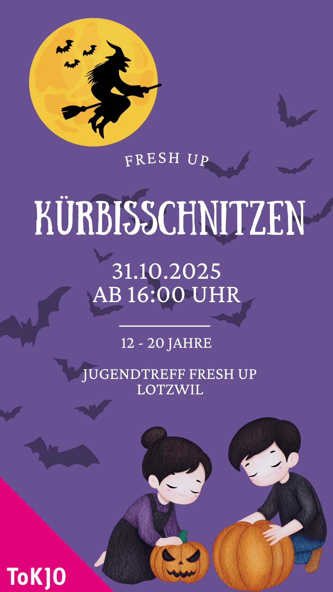 Am Freitag 31. Oktober findet ab 16:00 Uhr im Jugendtreff Fresh Up Lotzwil ein Kürbisschnitzen mit anschliessendem Kürbissuppenessen statt.