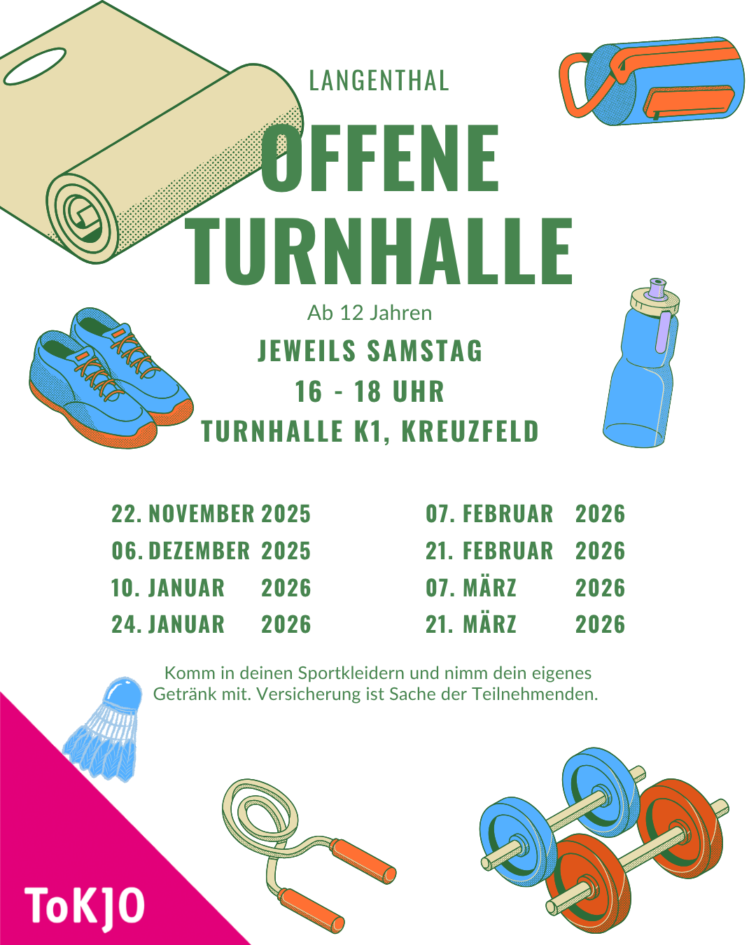 Wir bitten die Teilnehmenden, in ihren Sportkleidern zu kommen, da uns die Garderoben nicht zur Verfügung stehen. Nebst geeigneten Hallenschuhen empfehlen wir ein Getränk und Lust zur Bewegung mit zu bringen.