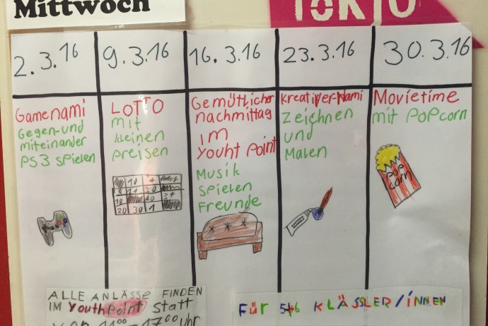 An vier Sitzungen wurde ein Programm von und für 5./6.KlässlerInnen kreiert. Die Ideen wurden vorgängig durch alle Treffbesuchenden auf ein grosses Plakat notiert. Aus diesen Ideen gestaltete das Organisationsteam drei Plakate mit allen wichtigen Angaben zu den jeweiligen Aktivitäten. Diese Plakate werden danach in der Schule aufgehängt. Die Aktivitäten findet immer von 14.00-17.00 Uhr statt.