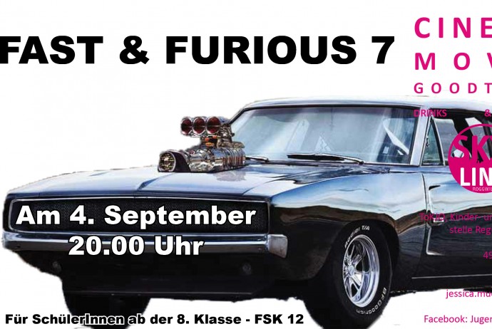 Am Freitag 4. September verwandelst sich der Jugendraum in ein Kino für Schülerinnen und Schüler ab der 8. Klasse. Türöffnung ist um 20.00 Uhr, es wird der Film „Fast & Furious 7“ gezeigt (FSK 12). Selbstverständlich kann man sich auch am ToKJOSK mit Getränken, Süssigkeiten oder Popcorn eindecken.