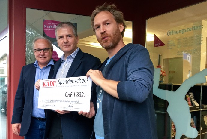 Da liess sich ToKJO-Leiter Thomas Bertschinger nicht zweimal bitten. Hatte Kurt Mosimann doch bei seinem Besuch auf der ToKJO-Geschäftsstelle an der Talstrasse einen Scheck über 1832 Franken dabei. Mosimann ist in der Geschäftsleitung der KADI AG für die Finanzen und das Rechnungswesen zuständig. Sein Besuch freute natürlich auch Peter Glanzmann. Zum Fototermin hatte der gleich zwei Hüte auf: als OK-Mitglied der City Athletics 2015 zeichnet er für die Mittelbeschaffung für den Grossanlass verantwortlich, dasselbe Ressort betreut er u.a. auch in der erweiterten Geschäftsleitung von ToKJO. Unternehmer Glanzmann sitzt zudem als Vertreter der Partnergemeinde Roggwil im Vorstand der regionalen Kinder- und Jugendfachstelle.