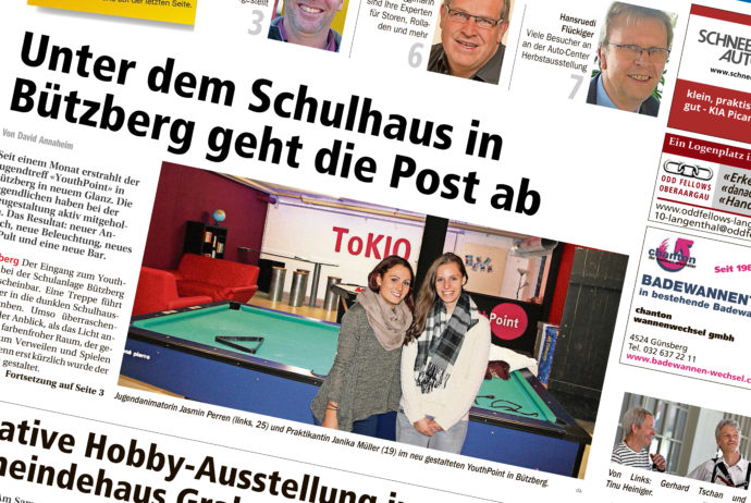 „Seit einem Monat erstrahlt der Jugendtreff «YouthPoint» in Bützberg in neuem Glanz. Die Jugendlichen haben bei der Neugestaltung aktiv mitgehol- fen. Das Resultat: neuer An- strich, neue Beleuchtung, neues DJ-Pult und eine neue Bar.“ schreibt die NOZ in ihrer Ausgabe vom 23. November 2016.
