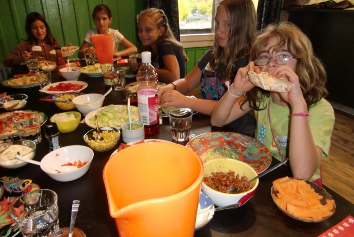Nur etwas war vorgegeben für diesen Kochnachmittag, es sollten Fajitas zubereitet werden. Danach durften die acht Mädchen und zwei Jungs selber entscheiden, was sie in die Tortillas füllen möchten. Bevor die ganze Gruppe zum Verkaufsgeschäft aufbrach, musste ein Einkaufszettel geschrieben werden. Alle Wünsche wurden berücksichtigt und der Einkaufswagen mit Tortillas, Tomaten, Pouletfleisch, scharfer Sauce, Peperoni und Eisbergsalat gefüllt. Zurück im Jugendkulturhaus Neon begannen die Kinder mit dem Zuschneiden der Zutaten und dem Braten des Fleisches. Nach und nach füllte sich der Tisch mit vielen leckeren Sachen, die allen das Wasser im Mund zusammenlaufen liessen. Jedes durfte nun seine Lieblings-Fajitas zusammenstellen und essen, bis alle Schüsseln leer waren.