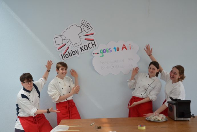 Das Hobbykochteam traf sich bereits um 8.00 Uhr in der Früh zur Vorbereitung. Fleissig wurden Karotten gerüstet, Zwiebeln gehackt und Chinakohl geschnitten. Die grösste Herausforderung war das Zubereiten der Frühlingsrollen. Nach mehreren Versuchen hatten die Jugendlichen den Dreh raus und waren mit dem Ergebnis mehr als zufrieden. Die Lebensmittel kühl verpackt und im Auto verstaut, begann die kulinarische Reise nach Aarwangen. Vor Ort wurde gemeinsam der Stand eingerichtet dun dekoriert. Nebst dem live-kochen waren die Kochblusen und die roten Schürzen des Hobbykochteams ein echter Hingucker. Die Zusammenarbeit bei den unterschiedlichen Ämtli lief wie am Schnürchen, als wäre es alltäglich für die Gruppe.