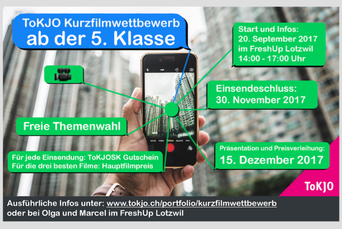 Bis am 30. November 2017 können Kurzfilme mit einer Maximallänge von 8 Minuten bei den zuständigen ToKJO-Mitarbeitenden Marcel und Olga eingesendet werden. Thematisch ist das Projekt völlig offen. Man kann seine Herbstferien dokumentieren, einen kleinen Spielfilm gestalten, Experimente filmen, Hobbies zeigen oder etwas ganz anderes ausprobieren.