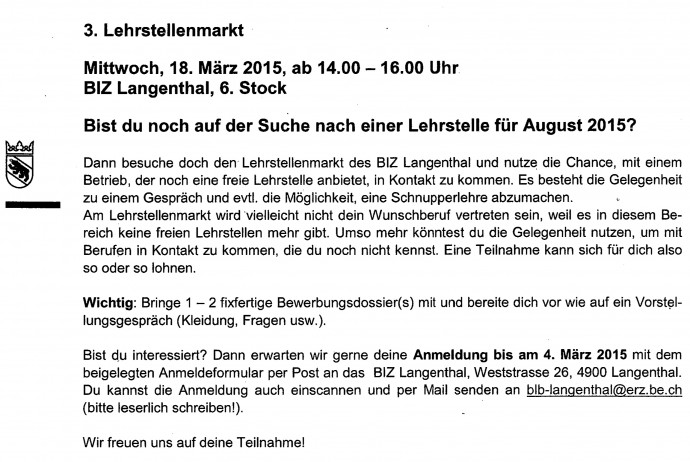 Das BIZ (Berufsberatungs- und Informationzentrum) Langenthal organisiert am 18. März 2015 erneut einen Lehrstellenmarkt. Der Lehrstellenmarkt bietet Jugendlichen die Möglichkeit, Ausbildungsbetriebe persönlich kennen zu lernen.