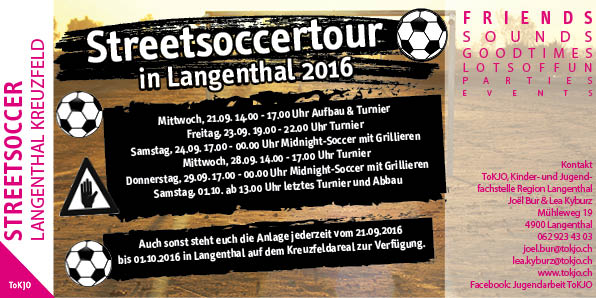 Die Streetsocceranlage ist vom 21.09.2016 – 01.10.2016 auf dem Kreuzfeldareal in Langenthal. Wir haben ein Programm zusammengestellt, an dem wir die Anlage gemeinsam mit euch bespielen werden inkl. zwei Midnight-Soccer und Grillieren. Weitere Infos kannst du dem Flyer entnehmen.