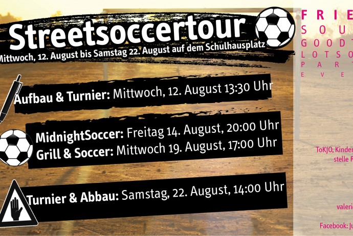 Wie im letzten Jahr wird die Anlage auf dem roten Platz beim Obersufenschulhaus stehen. Am 12. August findet das erste Turnier statt, danach freuen wir uns auf spannende 10 Streetsoccer-Tage.