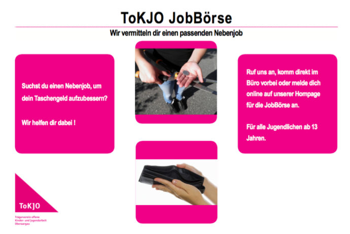 Das Taschengeld reicht schon wieder nicht aus? Etwas Schönes beim „gänggälä“ gesehen, aber leider nicht das nötige Geld dafür? In diesem Falle kann vielleicht die ToKJO Jobbörse weiterhelfen. Es ist eine Plattform für Schüler & Schülerinnen, welche sich gerne etwas dazu verdienen möchten. Ausserdem bieten die Jobs die Möglichkeit, einen ersten Einblick ins Berufsleben zu erhalten und seine Fähigkeiten zu entdecken.