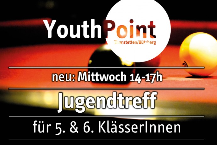 Ab dem 14. Oktober öffnet das YouthPoint auch für SchülerInnen der 5. & 6.Klasse jeweils am Mittwochnachmittag von 14.00 -17.00 Uhr die Türen.