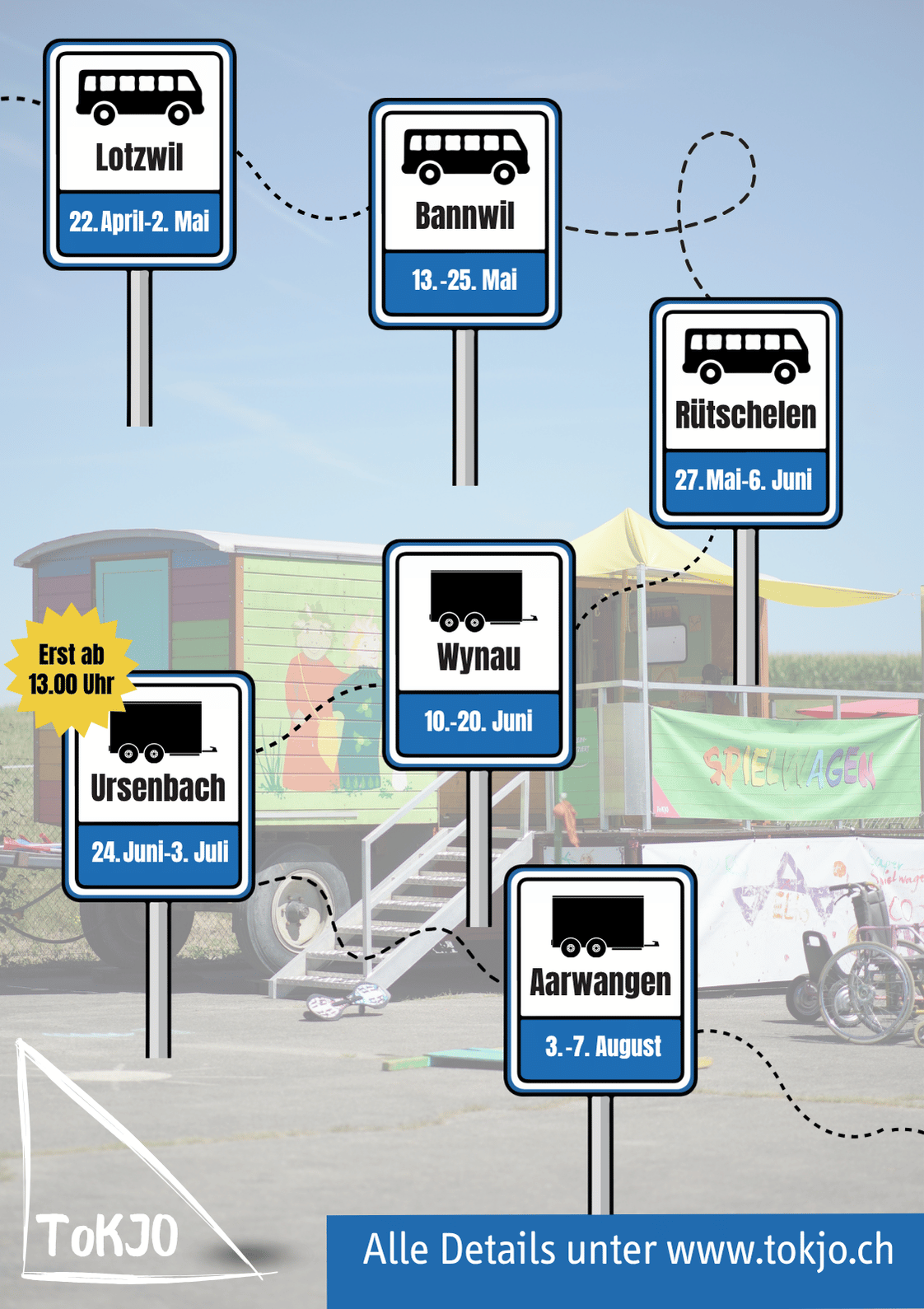 Ein Besuch lohnt sich auf jeden Fall. Parkplätze werden zu Spielplätzen, der Schulhausplatz zum Treffpunkt für Kinder und ihre Familien und Freunde und Freundinnen. Wenn der Spielwagen oder das Spielolino von ToKJO zu Gast ist, schlagen Kinderherzen höher, denn es gibt viel zu entdecken und auszuprobieren. Wie immer haben die ToKJO Mitarbeitenden diverse Fahrzeuge dabei, Strassenkreiden, klassische Ball- & Gemeinschaftsspiele, eine kleine Werkstatt und etliche kreative Bastelmöglichkeiten. Beim Spielwagen kann man locker einen ganzen Nachmittag verbringen und hat danach noch immer nicht alles gesehen. Hast du Lust, den Spielwagen zu besuchen - dann schau dir den Tourneeplan bis zu den Sommerferien an:Spielwagen (Mittwoch, Freitag, Samstag 12.00Uhr-17.00Uhr):